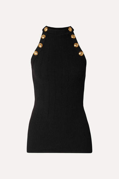 Sleeveless textured knit viscose-blend tank top in white. Square neck collar. Button detailing at front. Zip closure at back. Gold-tone hardware.Supplier color: White