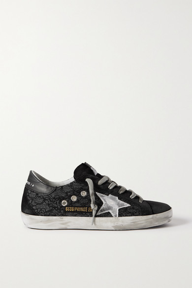 Superstar Distressed Suede, Leather And Glittered Lace Sneakers - Black