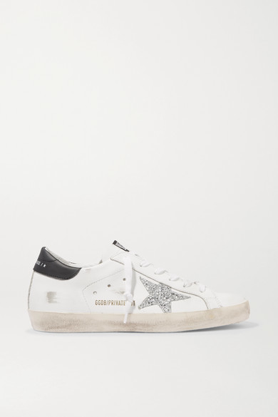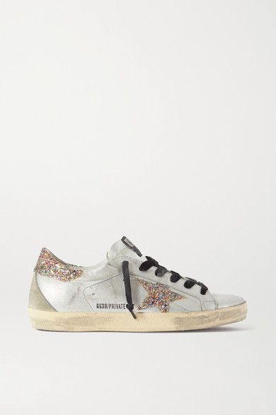 Superstar Distressed Glittered Leather And Suede Sneakers - Silver