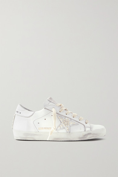 Superstar Faux Pearl-embellished Distressed Leather Sneakers - White