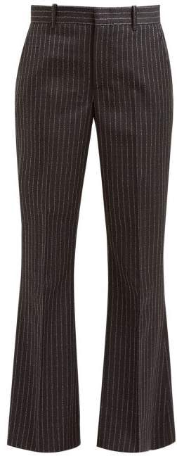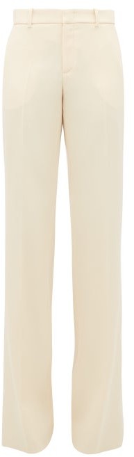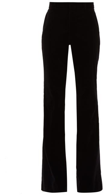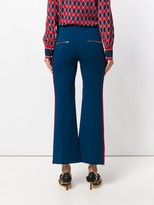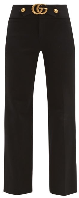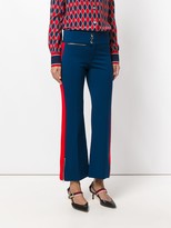 Founded in Florence nearly a century ago, Gucci is one of the biggest fashion influencers of all times. For the AW17 collection, the brand presents an iconic silhouette, inspired on the 70's. These blue flared trousers were crafted in Italy from stretch silk blend, featuring a multi press stud fastening, front zip pocket, rear zipped pockets, cropped length and a red stripe to the side.