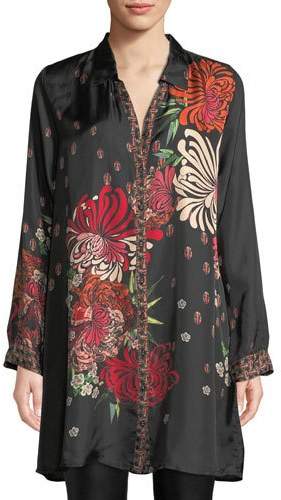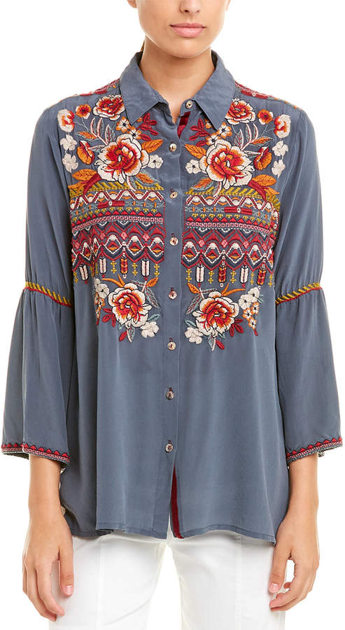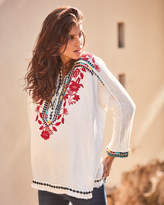Johnny Was "Belvedere" gauze blouse with colorful embroidery. V neckline; partial button front. Long sleeves. Relaxed silhouette. Below-hip length. Straight hem. Pullover style. Cotton. Machine wash. Imported.