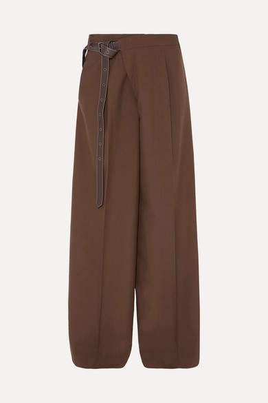 Leather-trimmed Wool Wide-leg Pants - Brown