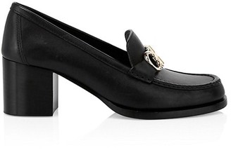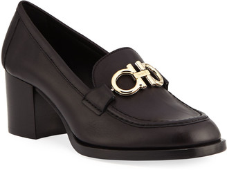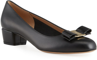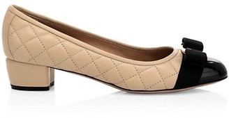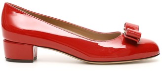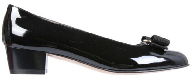 Salvatore Ferragamo "Vara 1" patent leather pump. 1 1/4" covered block heel. Signature Vara patent bow adorns round toe. Golden logo-engraved bow buckle. Leather insole and lining. Leather outsole with rubber heel inset. Made in Italy.