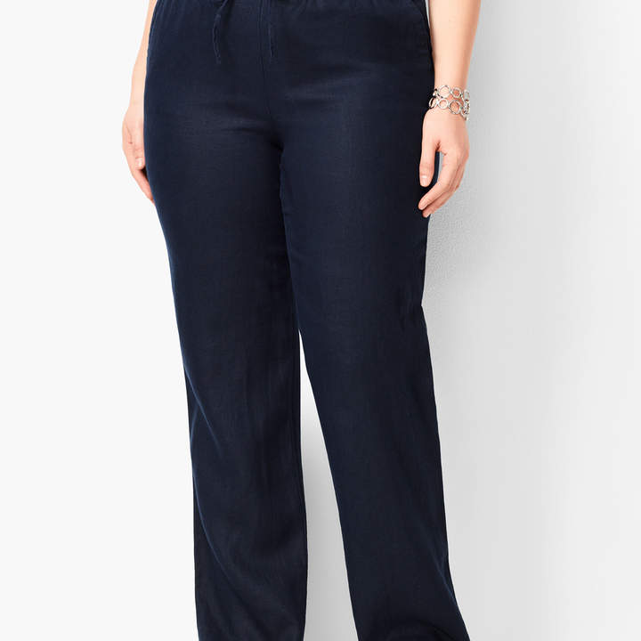 Details The casual elegance of linen with the ease of pull-on styling. Classic summery pants now available in a bold stripe design. A fashionable wide leg and an elasticized waist for comfort. Perfect for lounging at home or running errands around town. Mix with a pima tee and a pair of Sperry(R) sneakers. Features Wide Leg Hits: At Waist Full Length Closure: Pull On Back Welt Pockets Imported Fit and Material Fit: Inseam: Misses: 31"; Petite: 28.5"; Plus Size: 31"; Plus Size Petite:28.5" Material: 100% Linen Care: Machine Wash; Tumble Dry Low