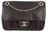 Guaranteed Authentic! - Black perforated leather Chanel Small Up in the Air flap bag with silver-tone hardware, dual chain-link and leather shoulder straps, single pocket under front flap, tonal woven lining, single zip pocket at interior wall and CC turn-lock closure at front flap. Serial number reads 18543210. Shop authentic designer handbags by Chanel at The RealReal.