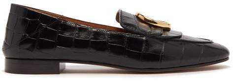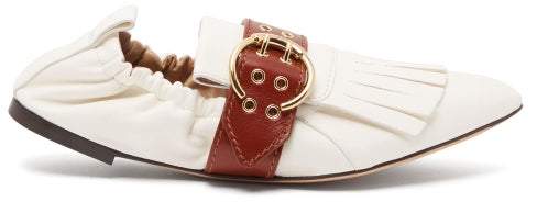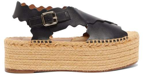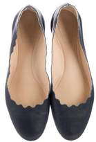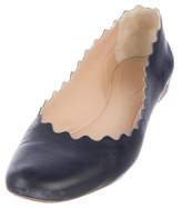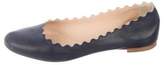 Navy leather Chloé Lauren flats with scalloped trim at top lines and stacked heels.
