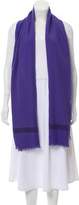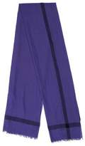 Periwinkle and indigo Hermès woven shawl with striped motif and raw-edge trim.